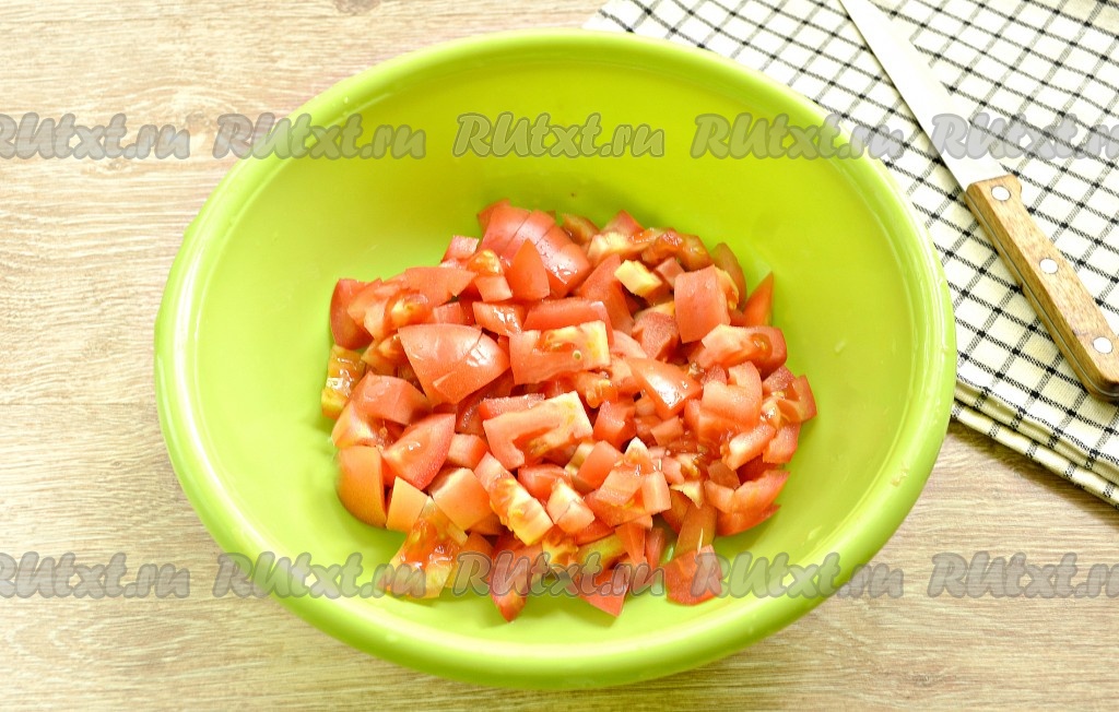 С помидоров срезаем место, где росла плодоножка, а затем нарезаем их на небольшие кусочки.