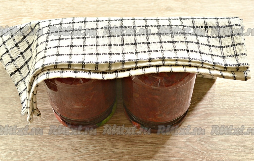Закручиваем банки с заправкой прокипячёнными крышками и ставим вверх дном. Укутываем тёплым пледом и полностью остужаем банки с заготовкой.