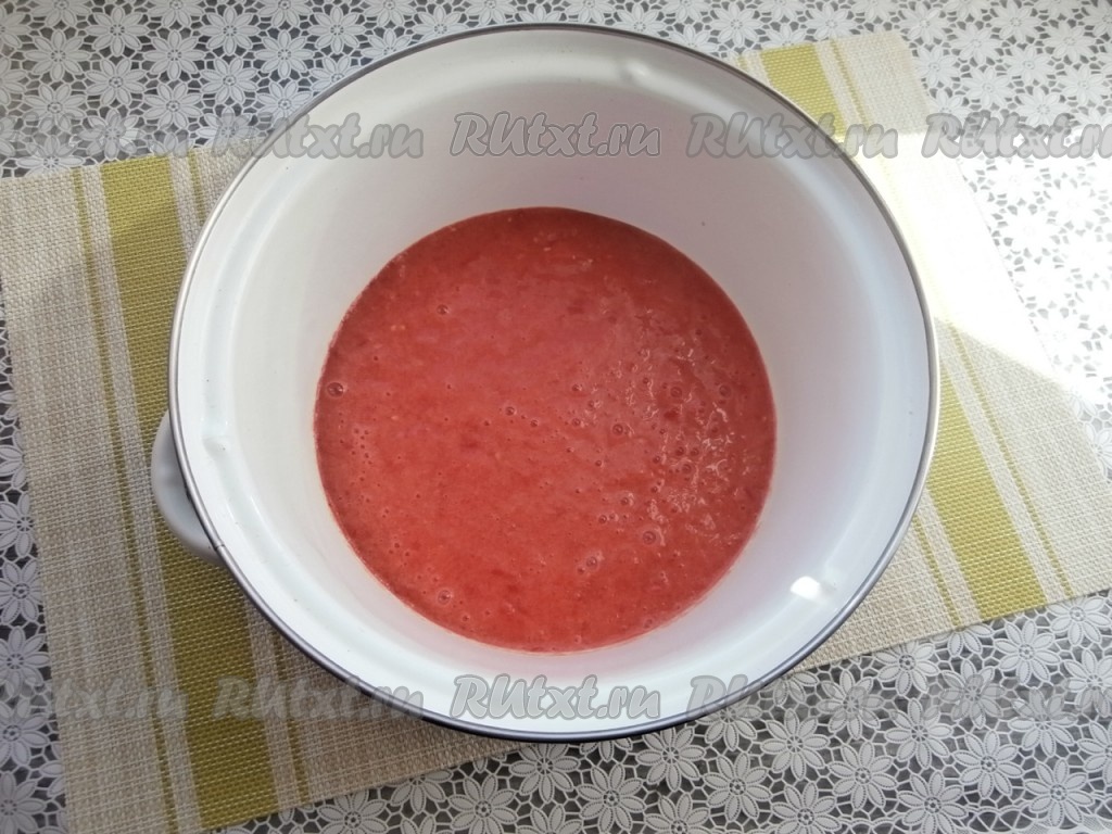Зубчики чеснока очистить. Удалить из болгарского перца семена. Пропустить помидоры через мясорубку (или измельчить в блендере), получившийся томат перелить в кастрюлю.