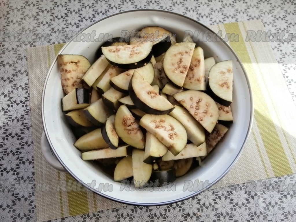 Баклажаны нарезать полукружочками толщиной около 1 см, немного посолить, оставить на 15 минут.