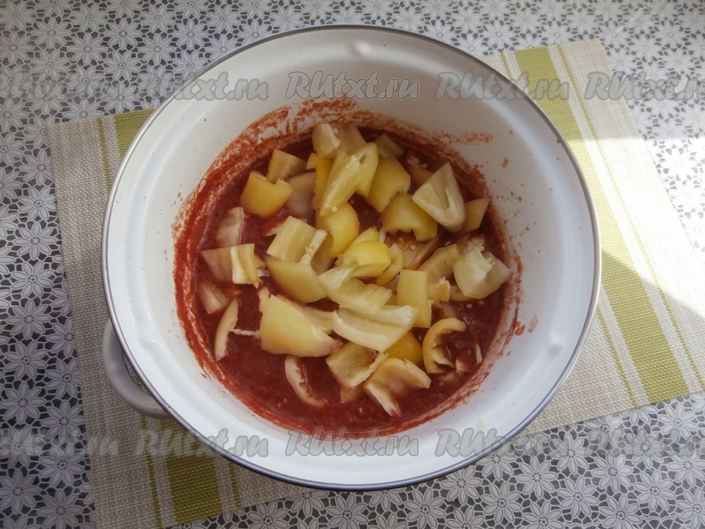Перемешать томат и снова довести до кипения. Затем добавить в кастрюлю нарезанный кусочками болгарский перец.