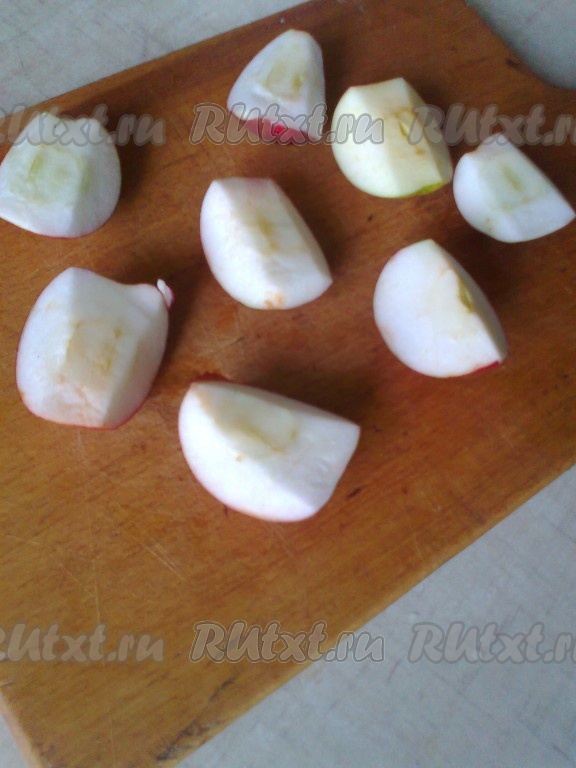Их можно не чистить от шкурки, если они твёрдые и при варке шкурка не отходит. Яблоки нарезать сначала на 4 части, удалить сердцевину.