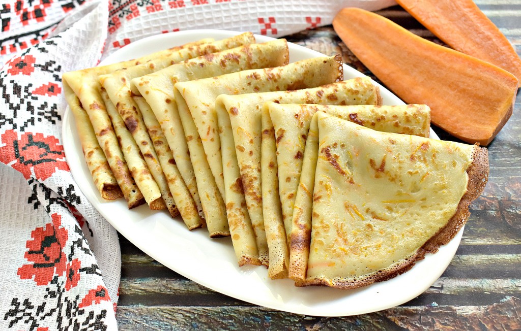 Если вы любите блинчики и стараетесь готовить их по различным рецептам, тогда предлагаю испечь морковные блины, замешанные на молоке. Особенность этих блинчиков в том, что натёртая сырая морковь добавляется прямо в тесто. Блины получаются просто изумительно вкусными, тонкими, аппетитными. Подавать морковные блинчики лучше горячими, дополнив сметаной.
