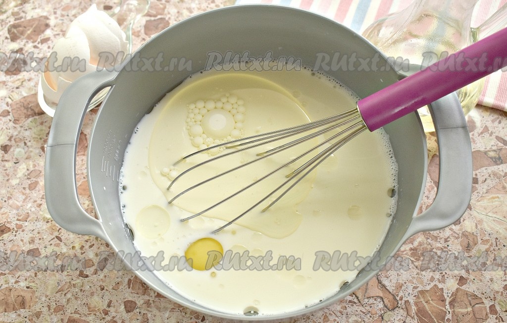 Молоко комнатной температуры вливаем в миску. Вбиваем к нему яйца, вливаем сразу 3 столовых ложки растительного масла, перемешиваем молочно-яичную смесь венчиком.