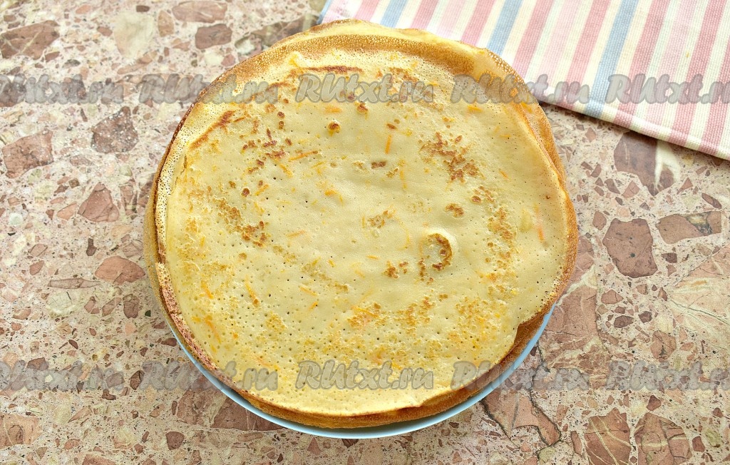 Перед выпечкой каждого блина не забываем перемешивать морковное блинное тесто, тогда оно будет иметь однородную консистенцию. Поверхность сковороды смазывайте, только если в этом есть необходимость. Постепенно пожарить все блины. Я жарила их на сковороде диаметром 18 сантиметров, у меня вышло 14 штук.
