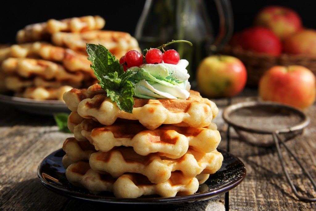 Вкусные, нежные, ароматные яблочные вафли, приготовленные в электровафельнице, подать к столу, дополнив вареньем, сгущённым молоком или сладкими соусами.