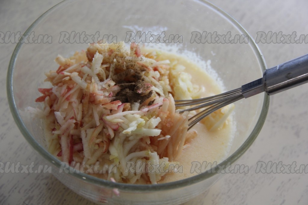 Добавить яблоки в тесто и всыпать корицу, перемешать венчиком.