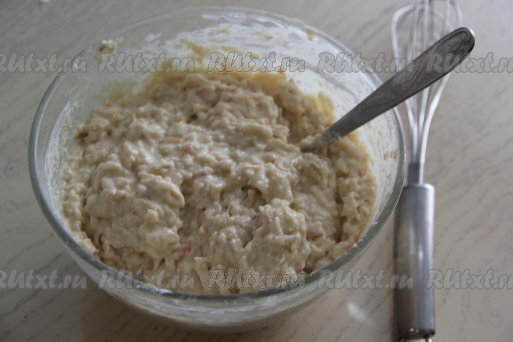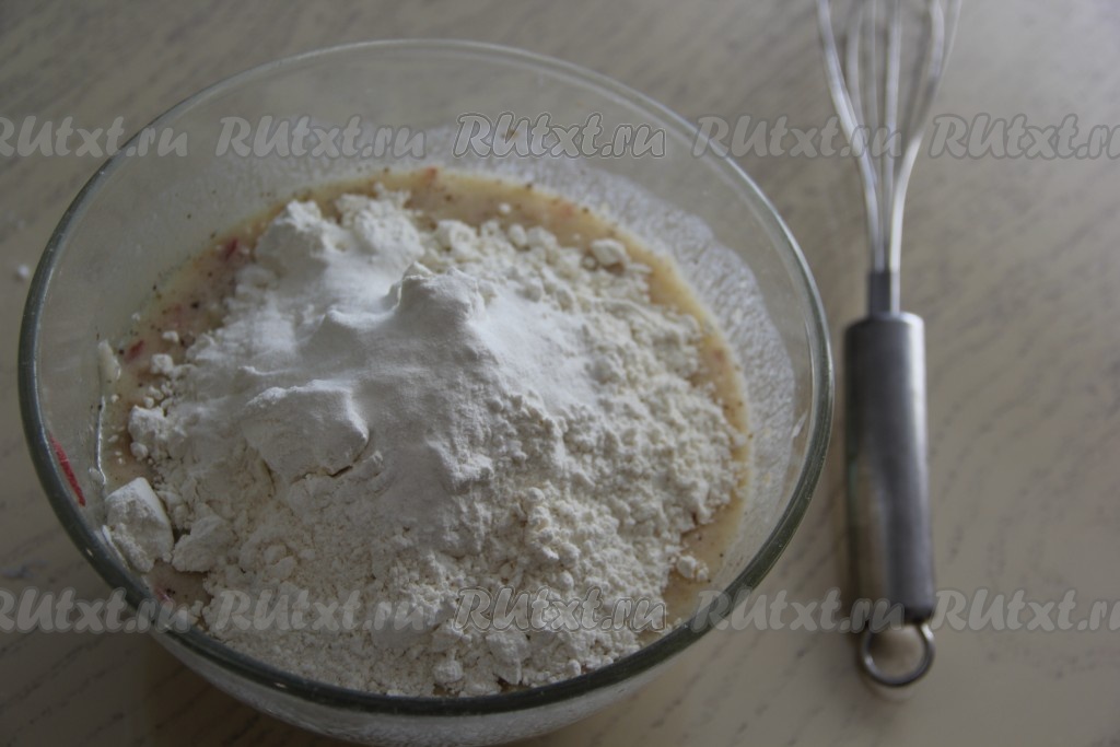 В получившееся тесто с яблоками всыпать муку и разрыхлитель, перемешать до однородности столовой ложкой (или лопаткой).