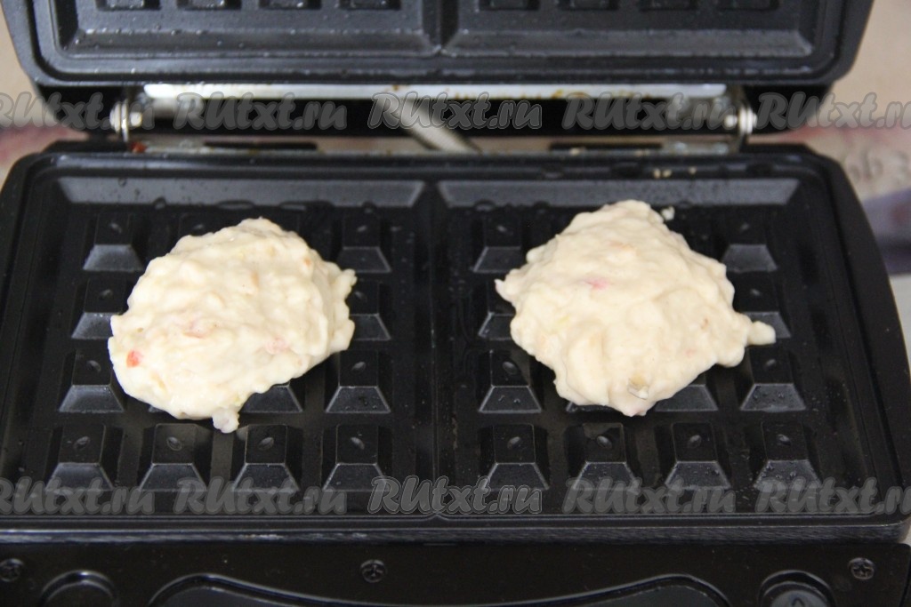 Электровафельницу хорошо разогреть и смазать растительным маслом при помощи кулинарной кисти. Я смазывала только перед выпечкой первой порции яблочных вафель. Выложить на каждую панель по 1,5 столовых ложки теста и закрыть крышку вафельницы.