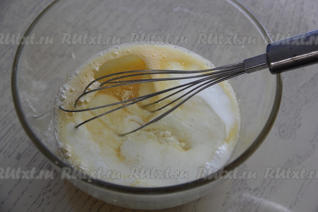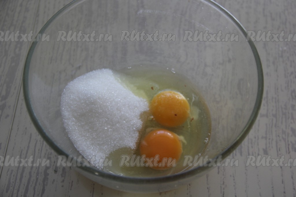 В миске, удобной для замешивания теста, нужно соединить яйца и сахар, перемешать венчиком, яично-сахарная смесь должна стать однородной.