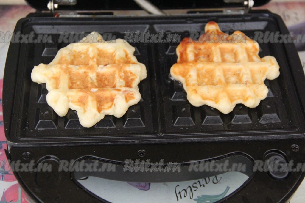 Выпекать вафли до золотистого цвета, затем переложить на тарелку. Постепенно испечь из оставшегося теста все вафельки.