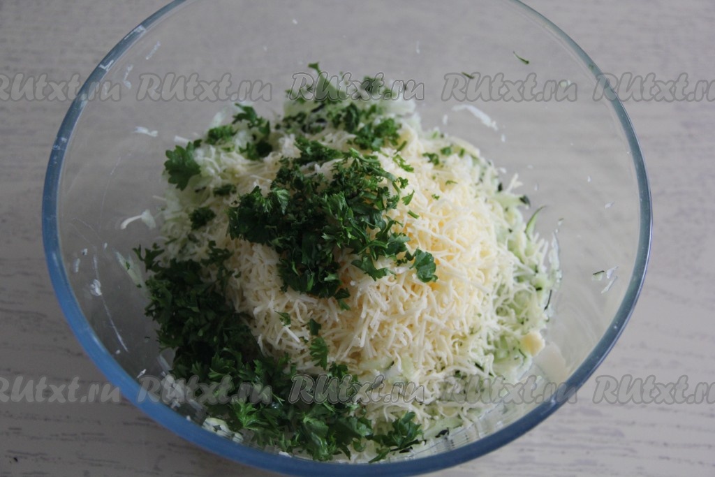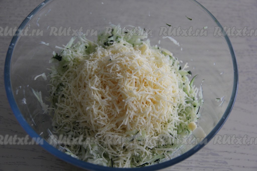 Сыр натереть на мелкой тёрке и добавить к кабачковой массе.