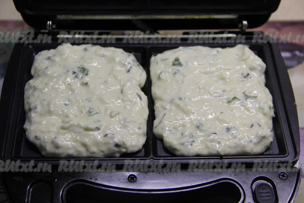 Вафельницу хорошо разогреть, по желанию, смазать панели растительным маслом. Выложить часть кабачково-сырного теста. Можно выкладывать по 2 столовые ложки теста, тогда получатся круглые вафли. Я заполняла тестом полностью всю панель и у меня получились прямоугольные вафли.