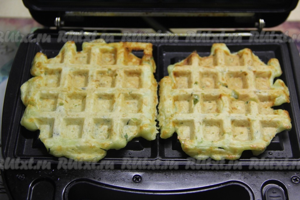 Закрыть крышку вафельницы и выпекать вафли из кабачков с сыром до золотистого цвета. Готовые вафельки переложить на тарелку, аналогично испечь вафли из оставшегося теста, каждый раз перемешивая его.