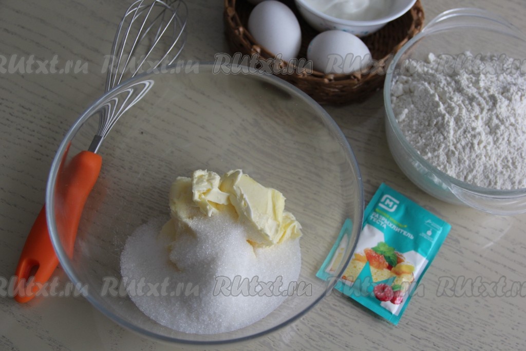 В достаточно глубокую миску всыпать сахар, ванильный сахар, выложить размягчённое при комнатной температуре (или растопленное) сливочное масло.