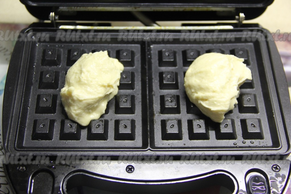 Вафельницу хорошо разогреть. Смазать поверхность вафельницы маслом только перед первой партией вафель (удобно смазывать панели с помощью силиконовой кисточки). Выложить по 1,5 столовые ложки теста на каждую панель и закрыть крышку.