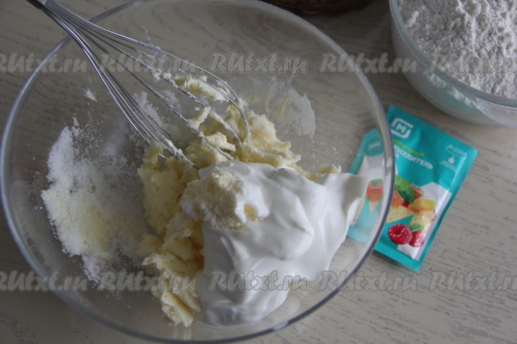 Перетереть венчиком масло с сахаром до однородности и добавить сметану.