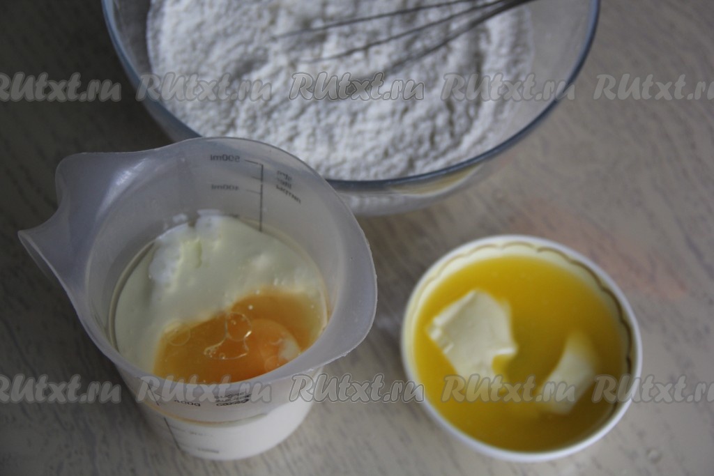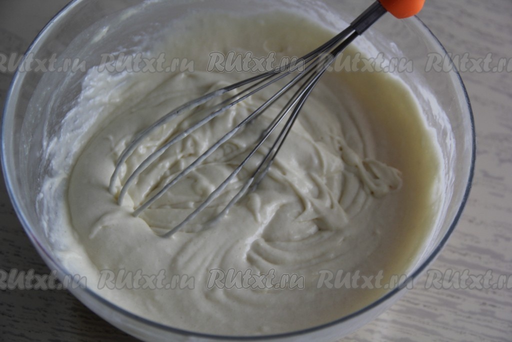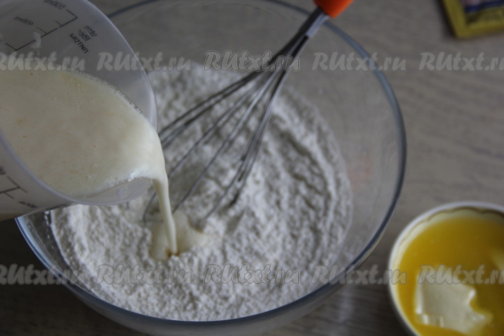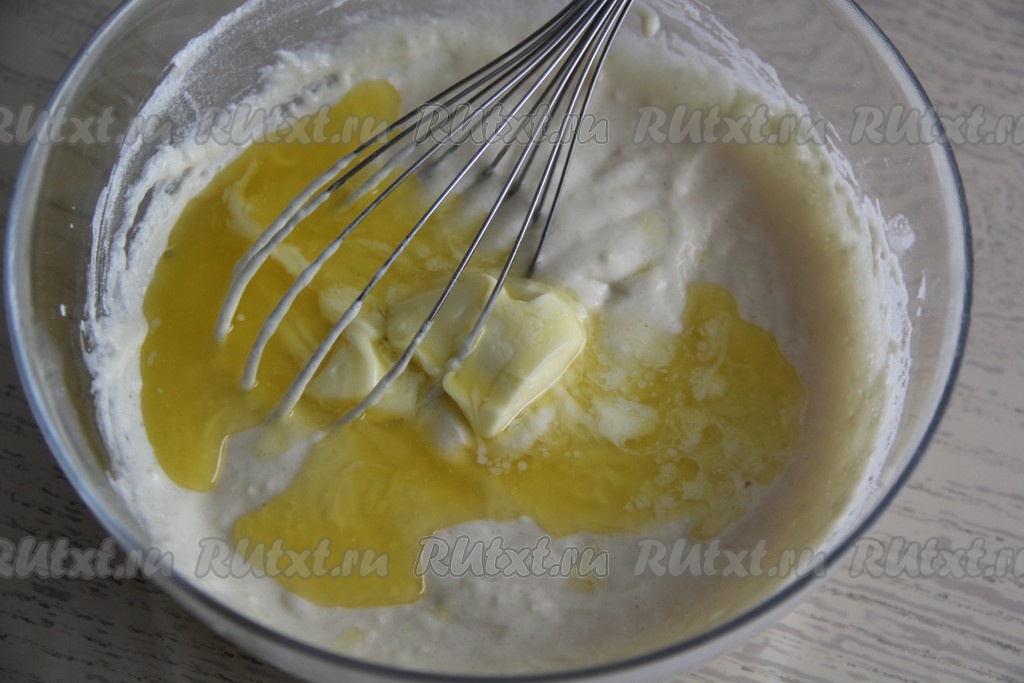 Перемешать массу венчиком и влить растопленное сливочное масло.