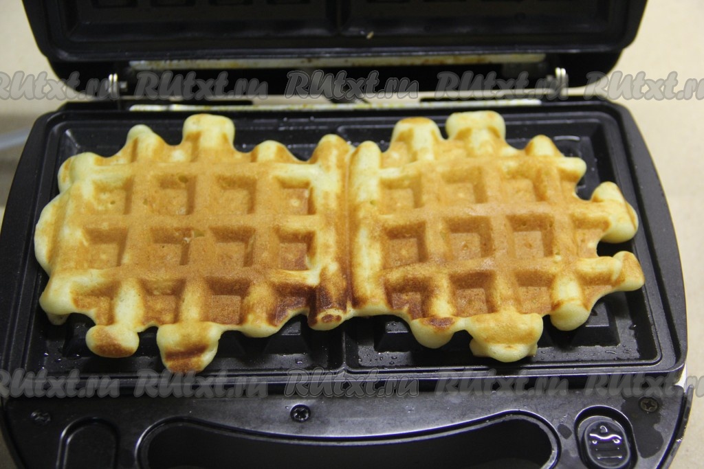 Очень хорошо разогреть вафельницу, по желанию, перед выпечкой первых двух вафель панели можно немного смазать маслом. Выложить на каждую панель по 1-1,5 столовых ложки теста, крышку закрыть  и выпекать бельгийские вафли до золотистого цвета. Таким образом испечь все вафли.