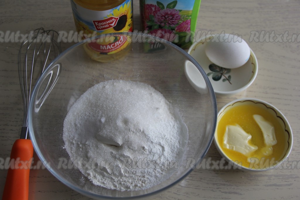 В миске для замеса теста соединить муку, сахар, соду, ванильный сахар, разрыхлитель и соль, перемешать получившуюся смесь сухих ингредиентов. В отдельной посуде растопить сливочное масло (полностью до жидкого состояния масло я растапливать не стала), дать немного остыть.