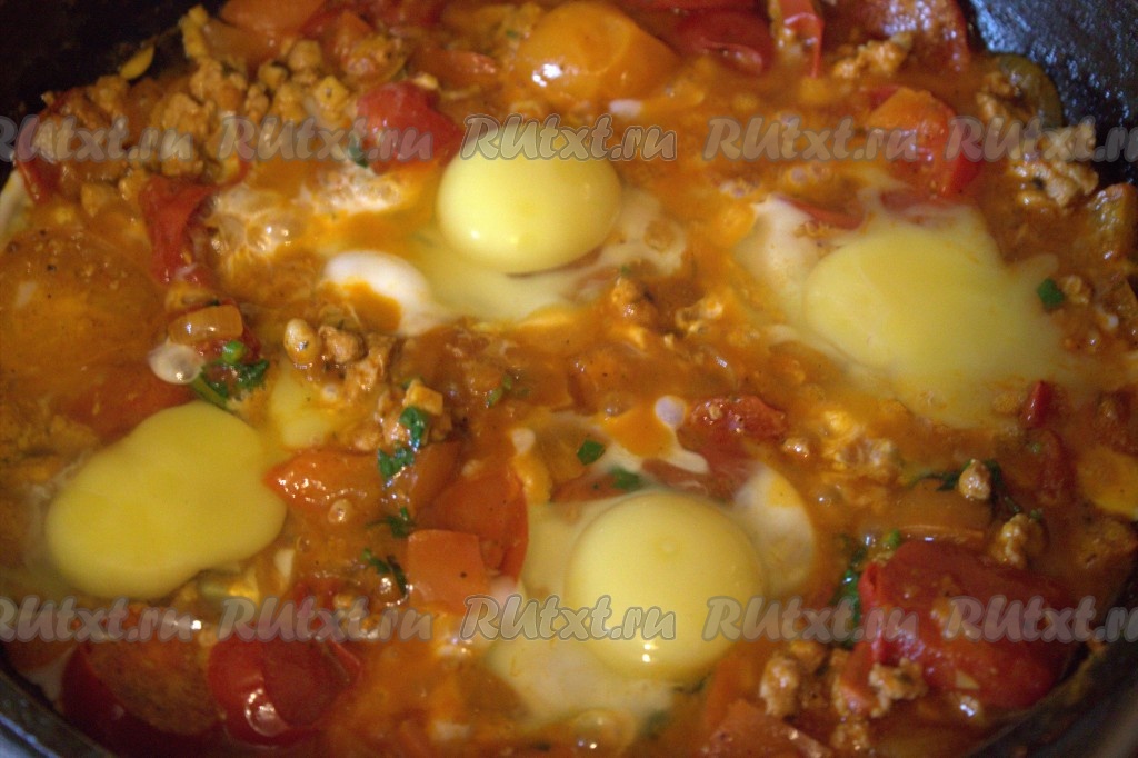 Затем в содержимом сковороды сделать углубления и вбить в них сырые яйца. Присолить яйца.