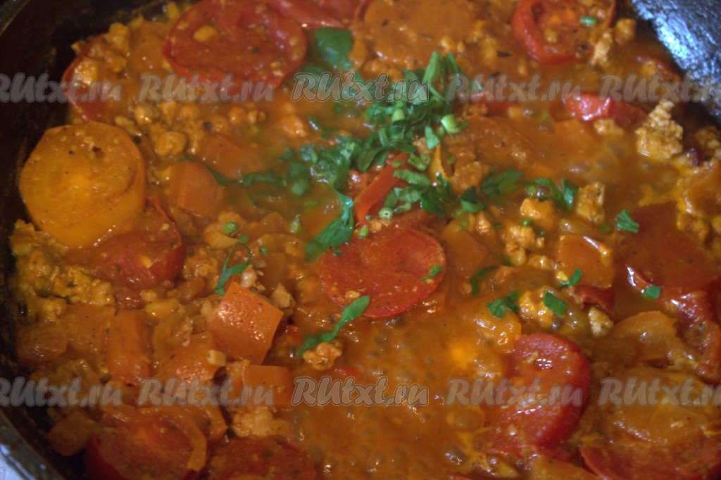 Далее влить воду, посолить по вкусу и добавить мелко нарезанные листочки петрушки (или кинзы). Если любите остренькое, то можно всыпать молотый красный перец. Дать воде закипеть и тушить на среднем огне овощи с фаршем до испарения жидкости (минут 5-7).