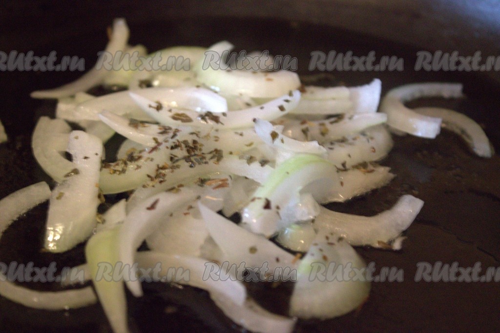 В сковороде с толстым дном разогреть растительное масло, выложить в неё очищенный и нарезанный полукольцами репчатый лук. Обжарить лук на среднем огне, помешивая, минуты 3-4. Посыпать сушёным розмарином.