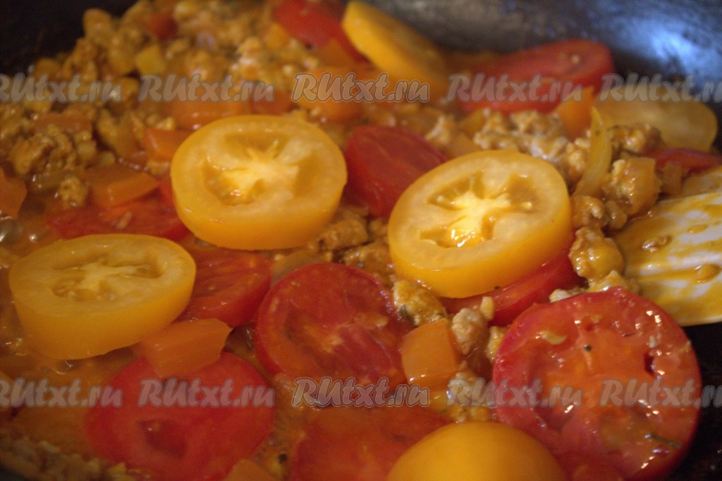 К фаршу, обжаренному с овощами, добавить кружочки помидоров. Обжаривать минут 7, иногда перемешивая, содержимое сковороды.