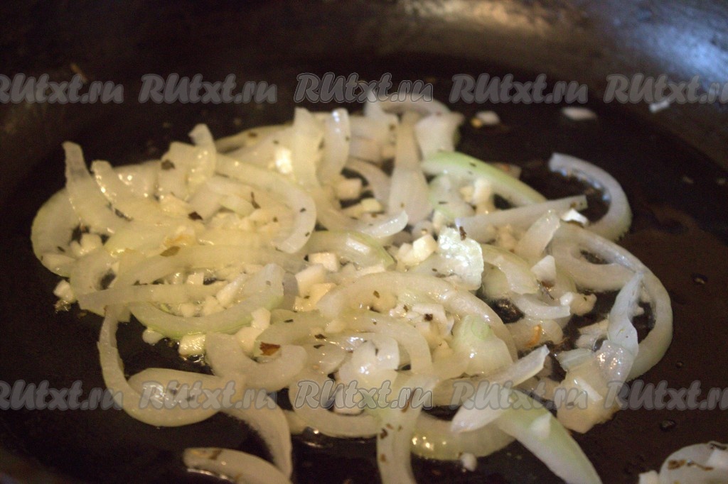Чеснок очистить и мелко нарезать. Добавить нарезанный чеснок в сковороду к луку и обжарить в течение 1-2 минут, не забывая помешивать.