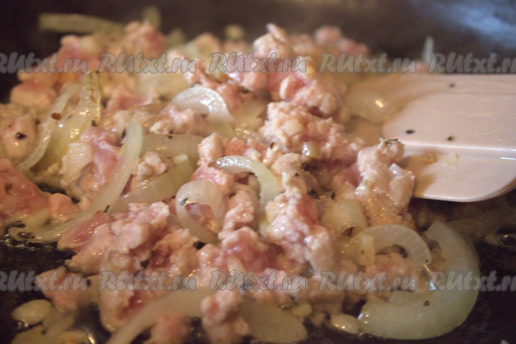 Выложить в сковороду к луку и чесноку мясной фарш. Разминая лопаткой комочки мяса, обжаривать фарш, примерно, 5 минут. Затем в сковороду добавить томатную пасту и хорошо перемешать.