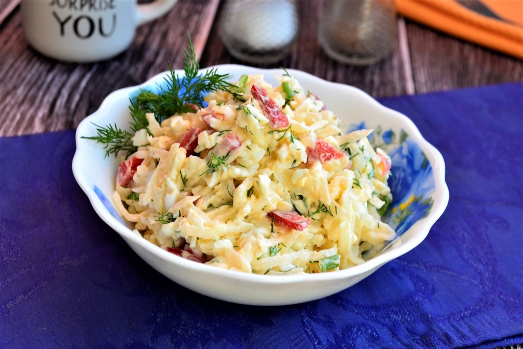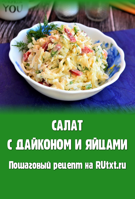 Дайкон - достаточно полезный овощ, поэтому его рекомендуют периодически употреблять в пищу. Предлагаю вам рецепт простого, очень вкусного и нежного салата, приготовленного с дайконом и яйцами. При желании, в это блюдо можно добавить болгарский перец яркого цвета (например, красный), который сделает внешний вид более привлекательным, а вкус - ещё более насыщенным. Майонез вы можете заменить сметаной. Этот салат с дайконом можно быстро приготовить и к повседневному обеду или ужину, и к неожиданному приходу гостей.