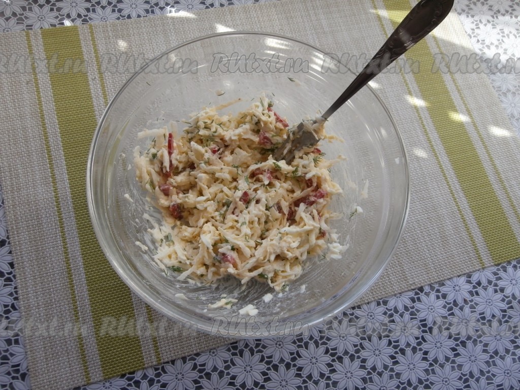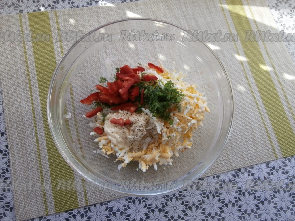 Сюда же добавить нарезанный соломкой болгарский перец, очищенный от семечек, и майонез, посолить салат и поперчить.