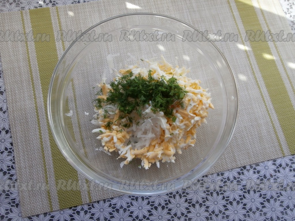 В миску с дайконом добавить нарезанные варёные яйца и измельчённый укроп.