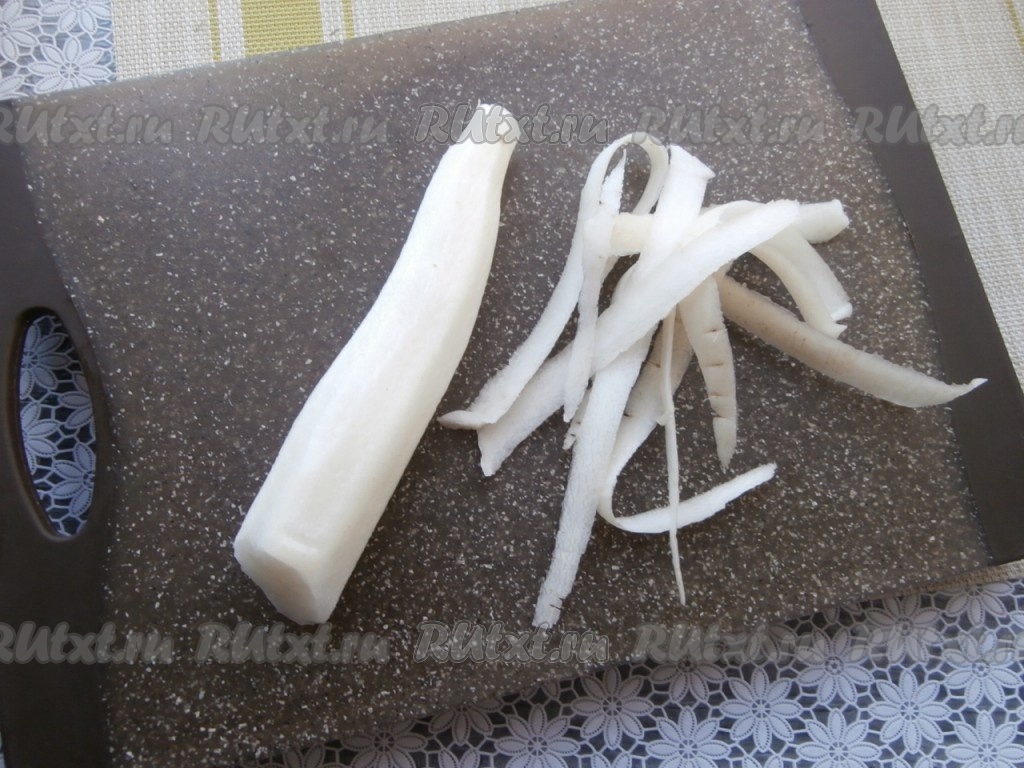Натереть дайкон на крупной тёрке, немного отжать, удаляя выделившийся сок, и переложить в миску.