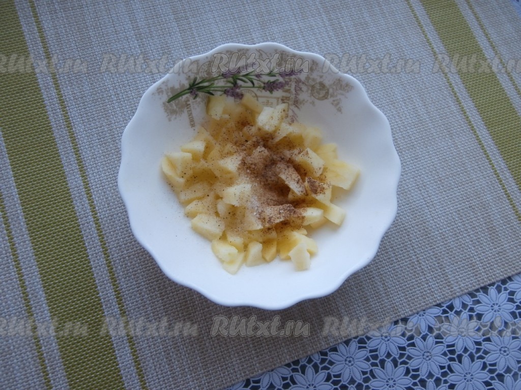 Достать яблоки из микроволновки, всыпать сахар, соль и корицу.