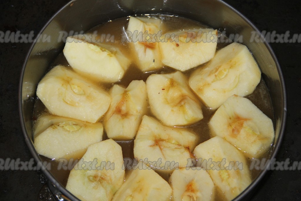 Разъемную форму смазать сливочным маслом. Вылить на дно нашу карамель. Очищенные и разрезанные на четыре части яблоки уложить шляпкой в карамель. Яблоки выкладывать плотно друг к другу.