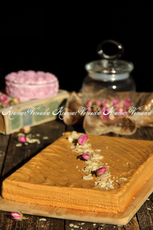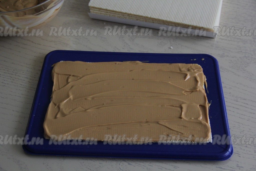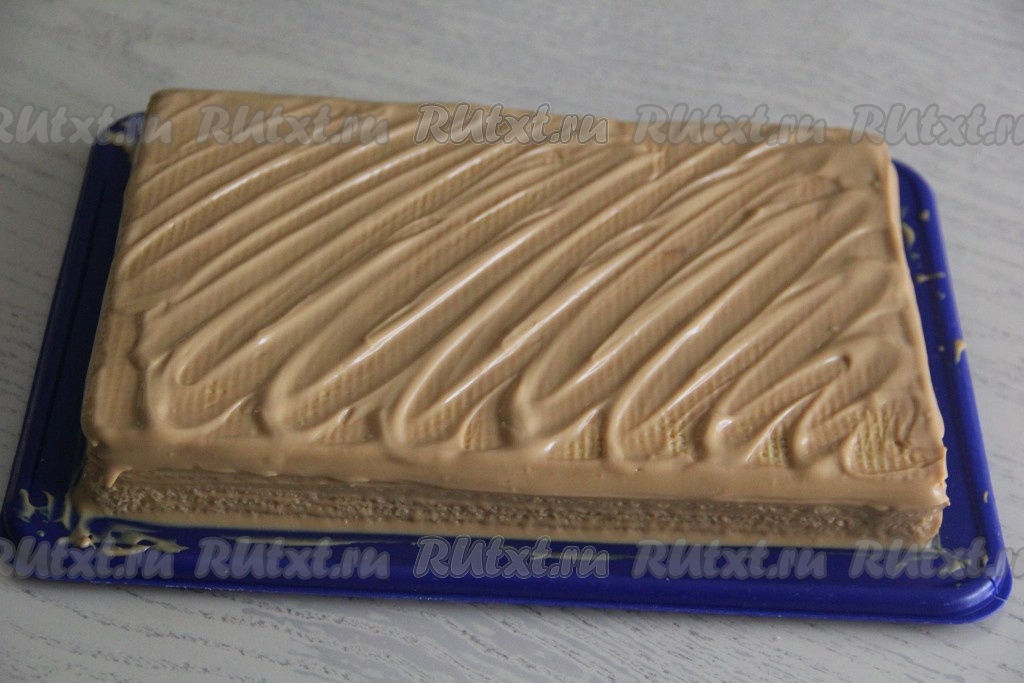 Обмазать бока и верх торта кремом. Я сделала волны из крема с помощью тыльной стороны обычной столовой ложки. Поставить торт в холодильник на 2-3 часа, вафельным коржам нужно дать как следует пропитаться кремом (время пропитки во многом зависит от толщины купленных вафельных коржей).