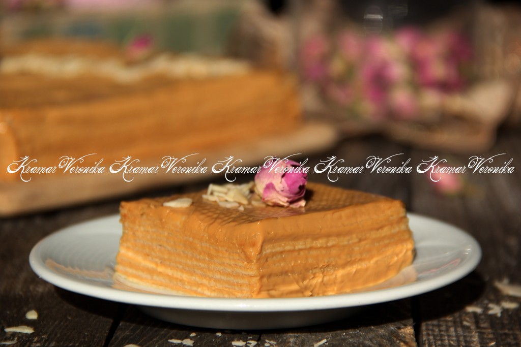 Перед подачей тортик можно украсить. Вот так достаточно просто из готовых вафельных коржей можно сделать нежнейший торт, пропитанный очень вкусным, в меру сладким кремом из сгущёнки и сметаны.