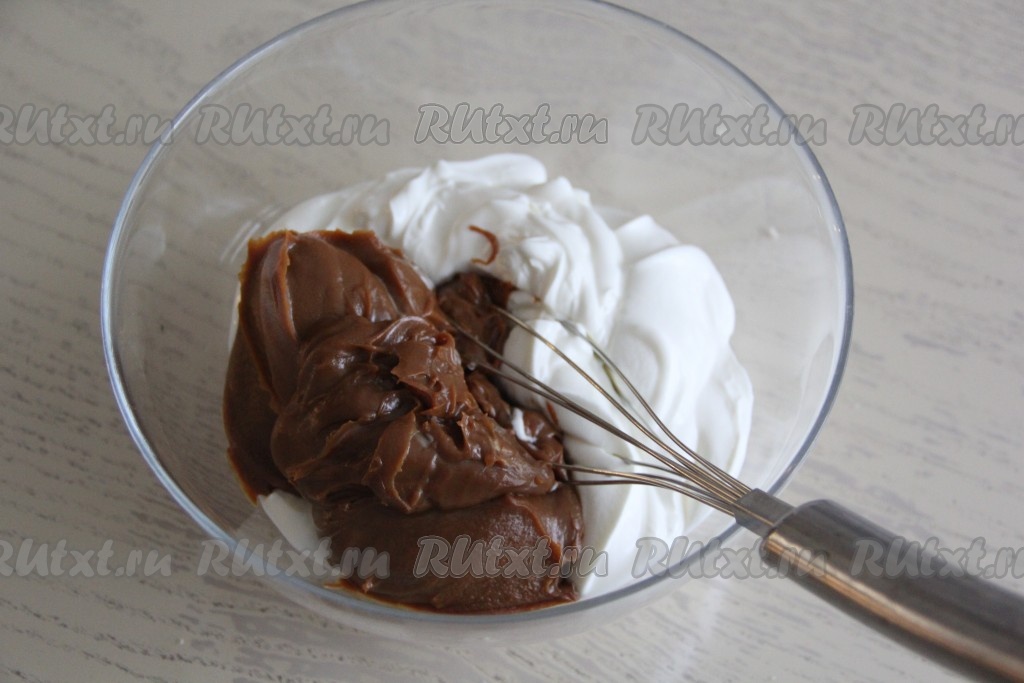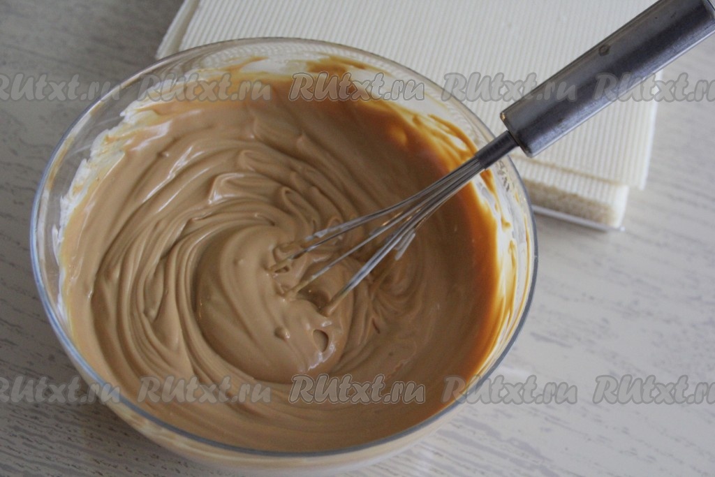 Венчиком перемешать крем из сгущёнки и сметаны до однородного состояния.