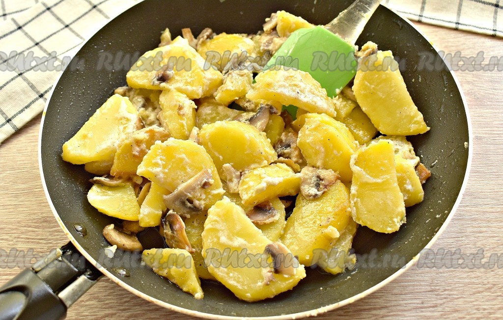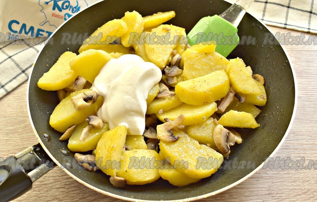 Затем к картошке с шампиньонам выкладываем сметану, перемешиваем.