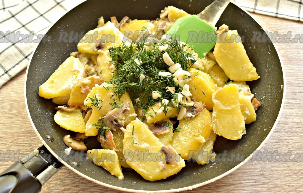 Картофель обжариваем с грибами, иногда помешивая, на среднем огне в течение минут 6-7.