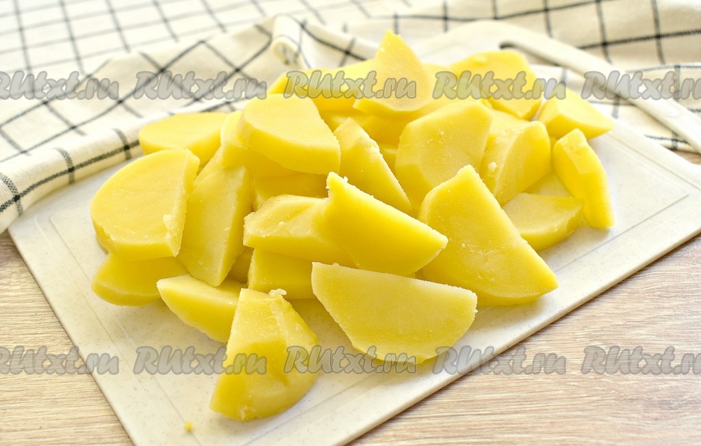 Средний по размеру картофель очищаем, ополаскиваем водой, выкладываем в кастрюлю, заливаем водой и ставим на огонь, после закипания уменьшаем огонь и отвариваем практически до готовности (в течение минут 10-15 с момента закипания). Картофелины должны стать мягкими, но не должны разваливаться. Воду из кастрюли сливаем, оставляем картошку немного остыть, а затем нарезаем её кружочками (или полукружочками) толщиной около 7 мм.