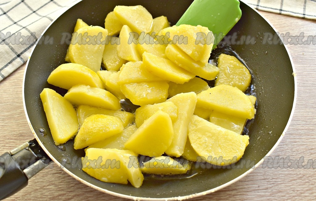 Нарезанный картофель выкладываем на сковороду, разогретую с растительным маслом, и обжариваем его на среднем огне до образования лёгкой румяной корочки со всех сторон, пару раз перемешиваем.