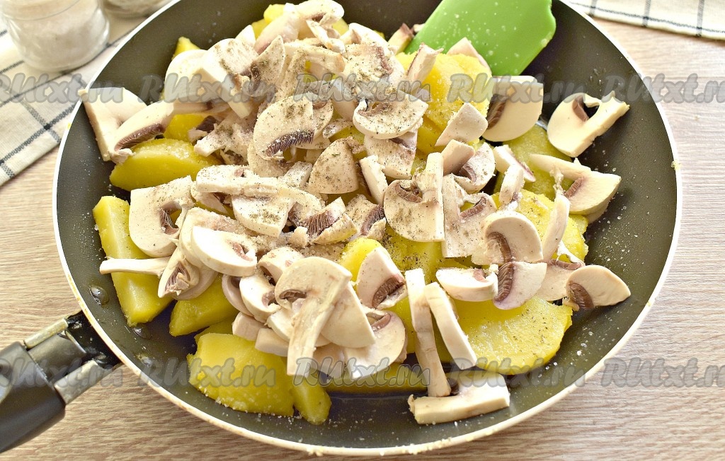К картошке, обжаренной до слегка румяной корочки, выкладываем нарезанные шампиньоны, солим, перчим, перемешиваем.