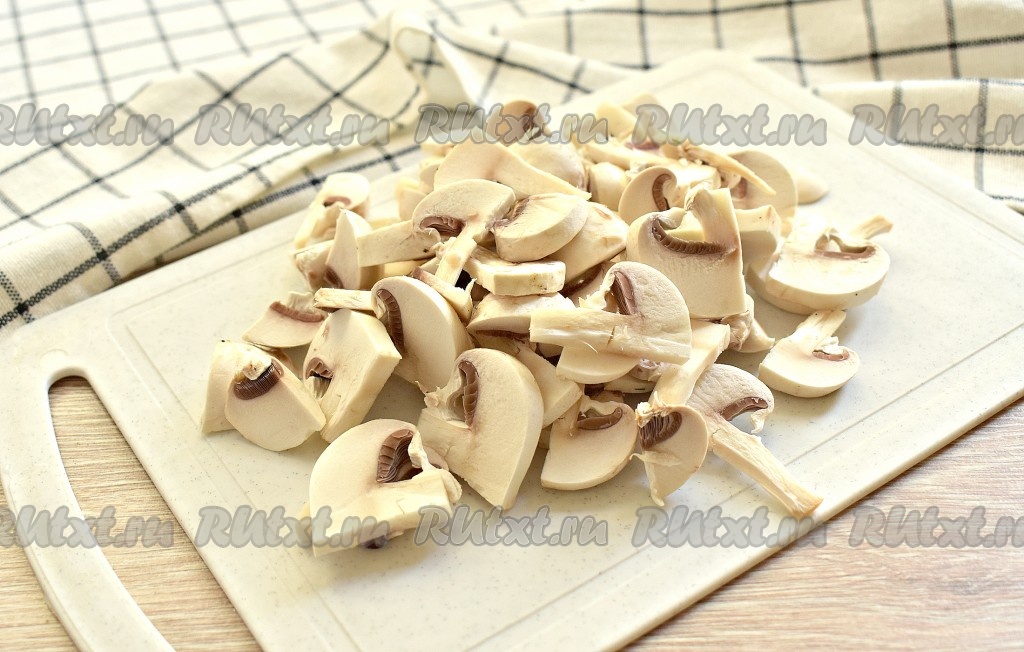 Свежие шампиньоны ополаскиваем, удаляя загрязнения, а затем нарезаем на пластинки.