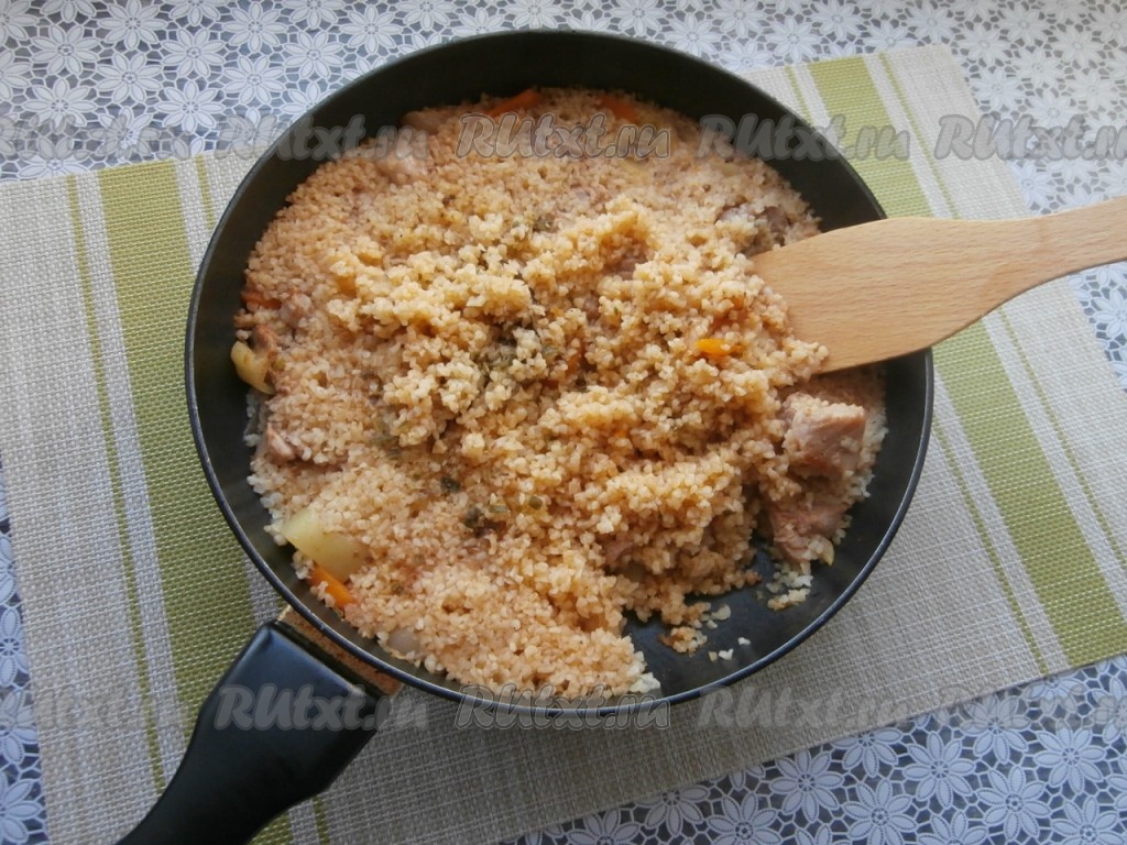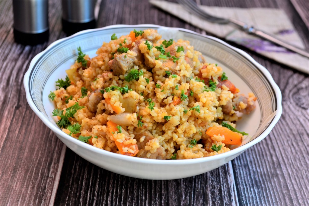 К столу подавать горячим. Рассыпчатый булгур отлично сочетается со свининой и овощами, создавая замечательную гармонию вкусов!