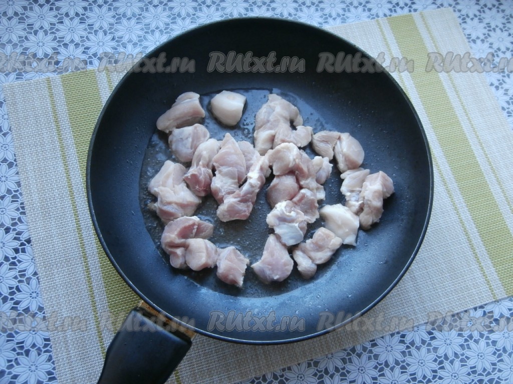 Разогреть сковороду с растительным маслом, выложить кусочки свинины.