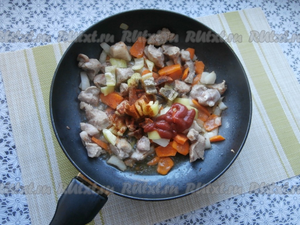 К обжаренным морковке, свинине и луку выложить перец болгарский, нарезанный кусочками, добавить соль, специи, томатный соус, чёрный молотый перец и паприку, перемешать, обжаривать 2-3 минуты.