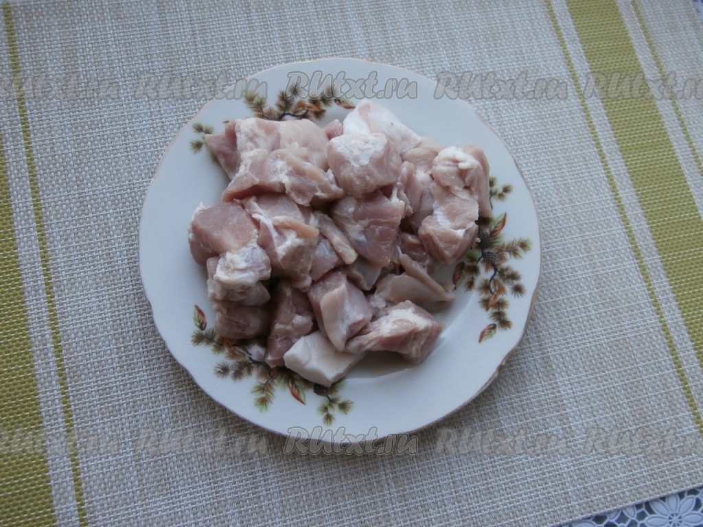 Лук и морковь очистить, удалить семена из болгарского перца. Свинину вымыть, нарезать небольшими кусочками.