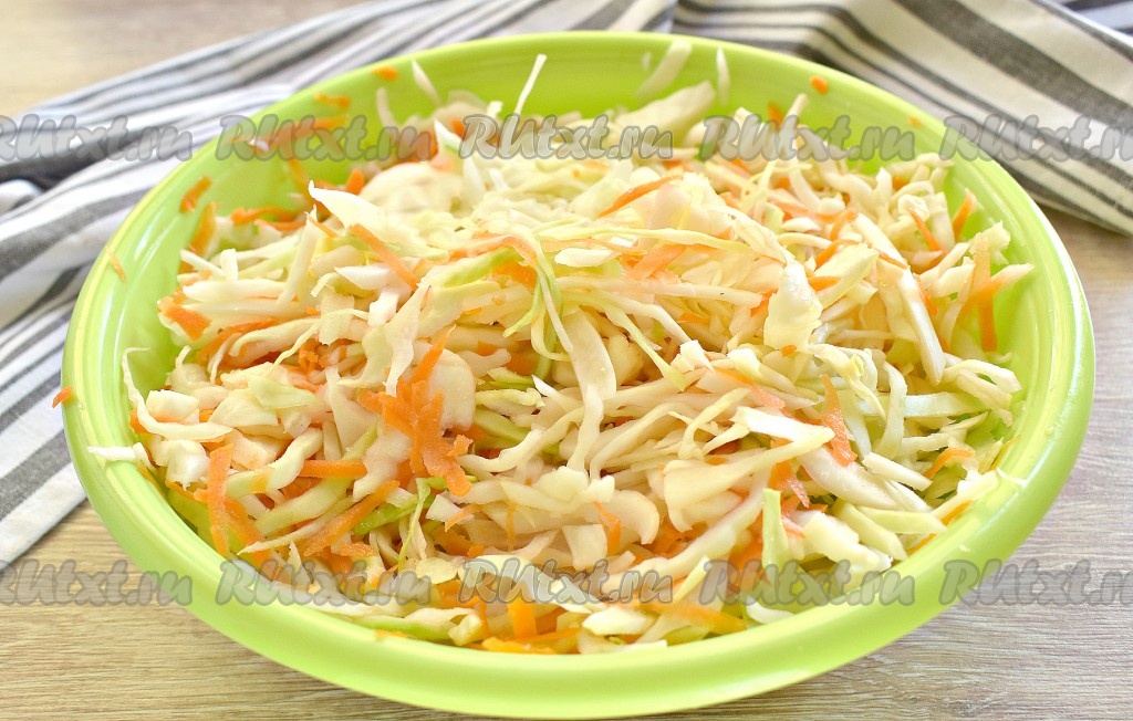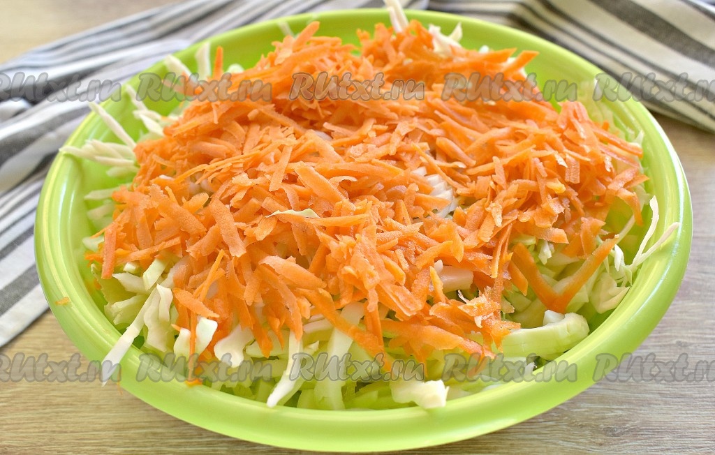 Нарезанные капусту и морковь выкладываем в достаточно глубокую миску.
